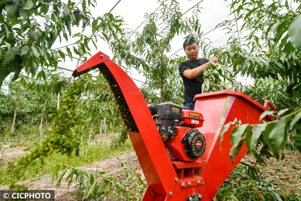↑2022年10月8日,在浙江省湖州市長興縣畫溪街道一家庭農(nóng)場,農(nóng)民操作自動秸稈撕碎機(jī)處理廢棄秸稈和樹枝,將碎料覆蓋裸露土壤表面,增加有機(jī)質(zhì),提高增肥率。CICPHOTO/譚云俸 攝
