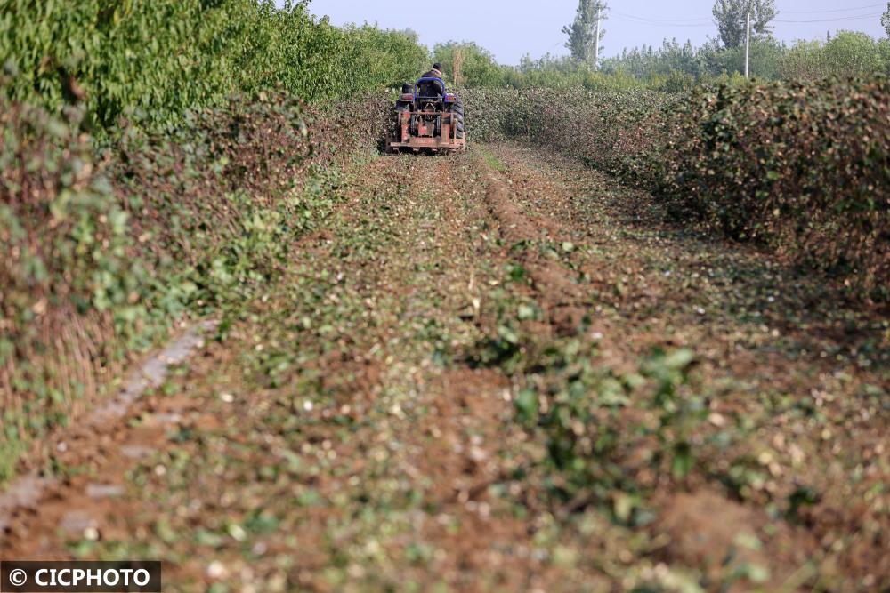 ↑2022年10月8日,在河北省邢臺市廣宗縣北塘疃鎮(zhèn)張固寨村,農(nóng)民駕駛農(nóng)機(jī)將棉花秸稈粉粹還田。CICPHOTO/王壘 攝