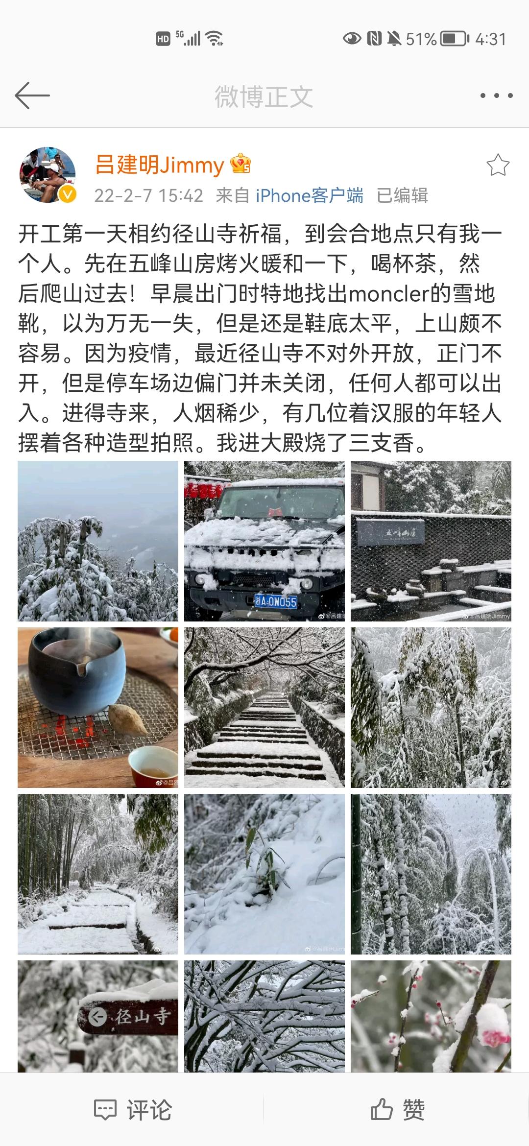 有意思的是,春節(jié)假期結(jié)束后的第一天,通策醫(yī)療董事長呂建明就因違反防疫政策引起眾怒。2月7日,呂建明在微博中表示,“開工第一天相約徑山寺祈?!?yàn)橐咔?,近徑山寺不對外開放……我進(jìn)大殿燒了三支香”。而該微博之前的版本是“……因?yàn)橐咔?,近徑山寺不對外開放,朋友聯(lián)系了寺僧,得以進(jìn)大殿燒了三支香?!本痛?,通策醫(yī)療也被調(diào)侃為“第一只燒香拜佛概念股”。