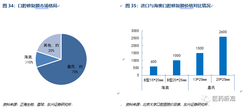 口腔修復(fù)膜產(chǎn)品打破外資壟斷,海奧品牌市占率達(dá)10%。國內(nèi)市場中瑞士蓋氏的修復(fù)修復(fù)膜占比達(dá)70%,正海生物的海奧口腔修復(fù)膜市場占比約10%以上,鑒于臨床療不劣于進(jìn)口產(chǎn)品,產(chǎn)品價格遠(yuǎn)低于進(jìn)口產(chǎn)品,進(jìn)口替代空間充足。