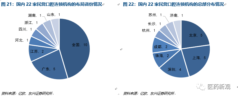 口腔醫(yī)療消費市場結(jié)構(gòu)區(qū)域化,民營資本涌入經(jīng)濟(jì)發(fā)達(dá)區(qū)域??谇会t(yī)療為消費醫(yī)療,相比普通醫(yī)療而言,擁有更多的消費屬性??谇会t(yī)療服務(wù)在擁有更大消費能力的一線二線城市發(fā)展迅速。22家的民營口腔連鎖機(jī)構(gòu)中的10家口腔機(jī)構(gòu)在全國范圍內(nèi)進(jìn)行布局,其余5家在廣東布局,2家在江蘇布局。22家口腔機(jī)構(gòu)中有14家的總部位于北京、上海、深圳一線城市,在珠海、成都分別有2家。
