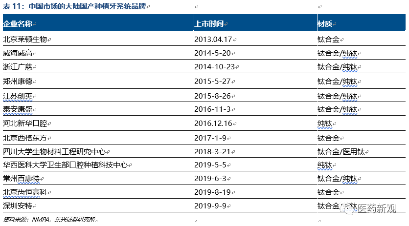外資企業(yè)壟斷中高端種植體市場,在中低端市場上,進(jìn)口種植體在技術(shù)水平較好、依然有較強(qiáng)的客戶黏性。目前國內(nèi)共有13個國產(chǎn)種植體品牌獲批上市,上市產(chǎn)品主要定位在低端市場,醫(yī)療機(jī)構(gòu)自主研發(fā)的種植體,以自用為主。目前已經(jīng)有北京萊頓BLB、威高WEGO、江蘇創(chuàng)英等企業(yè)的品牌已經(jīng)逐漸獲得醫(yī)療機(jī)構(gòu)與患者的認(rèn)可。