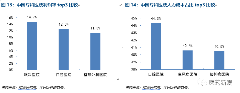 口腔醫(yī)院利潤率位列第二,人力成本占比高。通過比較??泼駹I醫(yī)院的利潤率與人力成本占比指標(biāo),口腔醫(yī)院的人力成本占收入比例高,達(dá)到44.3%,但利潤率約為12.5%,位列第二,僅次于眼科醫(yī)院,這表明口腔醫(yī)院對醫(yī)生的依賴度大,需要相關(guān)科室醫(yī)生的供給以滿足醫(yī)療服務(wù)需求,且口腔科醫(yī)生的人均盈利高,給口腔醫(yī)院培養(yǎng)醫(yī)生、擴(kuò)張業(yè)務(wù)提供較大動力。