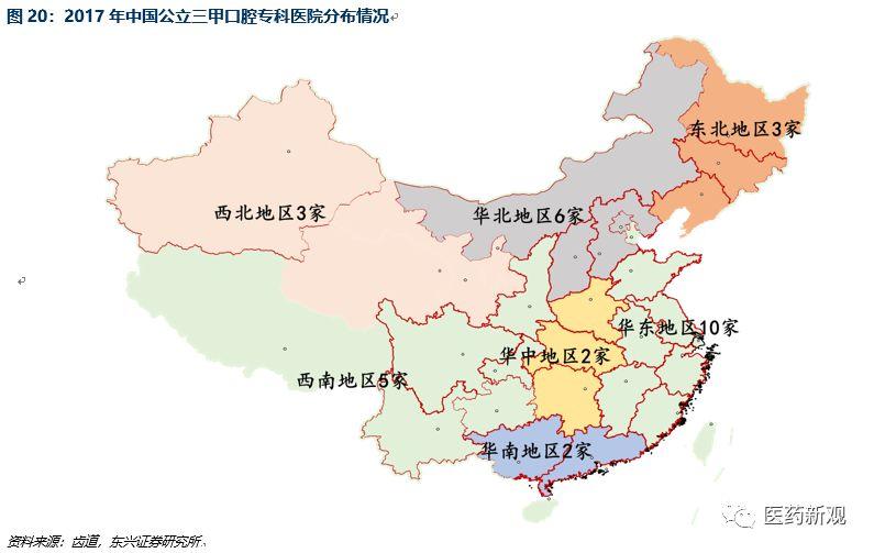經(jīng)濟(jì)發(fā)達(dá)地區(qū)擁有優(yōu)質(zhì)醫(yī)療資源與充足的醫(yī)療需求,促成高端三甲口腔醫(yī)院建立。2017年,全國(不含港澳臺)三甲口腔專科醫(yī)院數(shù)量為33家,其中,華東地區(qū)數(shù)量多,醫(yī)院數(shù)量為10家,華北、西南地區(qū)分別為6家、5家。具體從省份來看,經(jīng)濟(jì)發(fā)達(dá)的省份三甲口腔醫(yī)院布局更多。