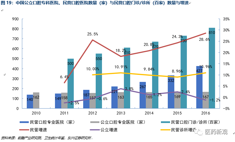民營口腔專科醫(yī)院發(fā)展迅速。2010年-2016年,民營口腔專科醫(yī)院數(shù)量由140家增加到427家,年均復(fù)合增長率達(dá)17.27%,增長速度不斷提高。雖然公立口腔醫(yī)療機(jī)構(gòu)受益于醫(yī)保支付,但市場化程度低,規(guī)模擴(kuò)張緩慢,民營口腔??漆t(yī)院數(shù)量與增速已經(jīng)超過公立口腔專科醫(yī)院發(fā)展情況。2011年-2016年,民營診所/門診由5萬家增加到8.1萬家,數(shù)量占比高。