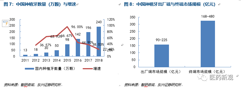 國內(nèi)種植牙年使用量達(dá)240萬顆,七年復(fù)合增速52%。在2011年-2018年,國內(nèi)種植牙數(shù)量由13萬顆增長到約為240萬顆,復(fù)合增長率達(dá)到51.7%。根據(jù)市場價格來看,單顆牙的出廠價約3750-9375元,終端市場價格約7000-20000元,種植牙的出廠端市場規(guī)模約90-225億元,終端市場規(guī)模約168-480億元。