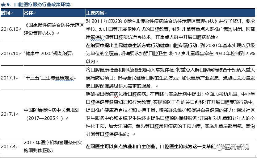 政策面持續(xù)支持國內(nèi)口腔醫(yī)療行業(yè)發(fā)展,推動牙科醫(yī)生供給改良。2016年以來,層面出臺一系列口腔醫(yī)療相關(guān)政策,以促進(jìn)口腔醫(yī)療行業(yè)發(fā)展,提高人民口腔醫(yī)療健康水平。