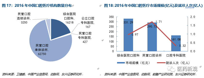 高度市場化,行業(yè)集中度低。2016年,國內(nèi)綜合醫(yī)院口腔科數(shù)量達(dá)到16218家,公立口腔??漆t(yī)院167家;民營口腔醫(yī)療機(jī)構(gòu)總計為66427家,其中民營口腔??漆t(yī)院數(shù)量為427家,大幅超過公立口腔??漆t(yī)院,口腔診所中單體診所數(shù)量達(dá)到62750家,連鎖診所數(shù)量為3250家。
