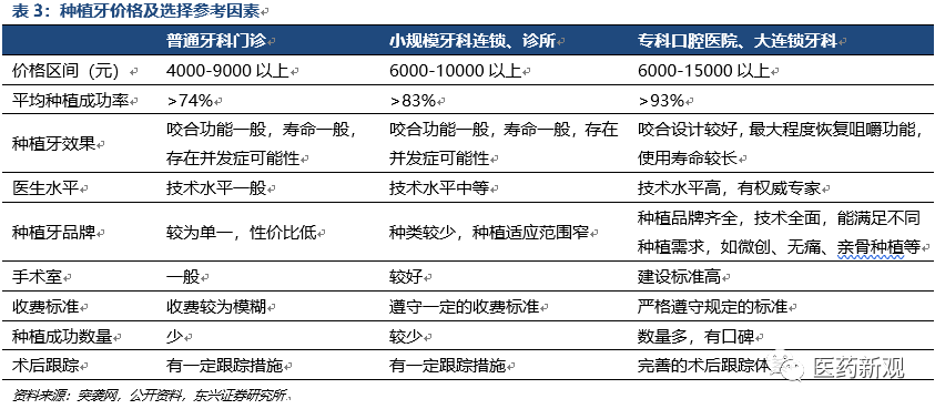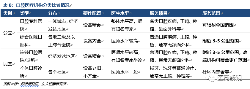 口腔醫(yī)療機(jī)構(gòu)服務(wù)遵循就近原則,種植業(yè)務(wù)依托“醫(yī)生+設(shè)備”的高端服務(wù)能力。通過對公立、民營醫(yī)院分類比較來看,除公立口腔專科醫(yī)院的服務(wù)能力輻射全國外,綜合醫(yī)院口腔科、連鎖口腔醫(yī)院(診所)、個體口腔診所均遵循就近服務(wù)原則,服務(wù)覆蓋約5公里范圍。同時,醫(yī)療機(jī)構(gòu)需配置高端硬件設(shè)施與高水平的醫(yī)生,才能開展種植、正畸、頜面外科等診療服務(wù)。高端口腔醫(yī)療服務(wù)能力的需求提升,也將促進(jìn)口腔??漆t(yī)院、綜合服務(wù)能力強(qiáng)的連鎖口腔醫(yī)院(診所)不斷發(fā)展。
