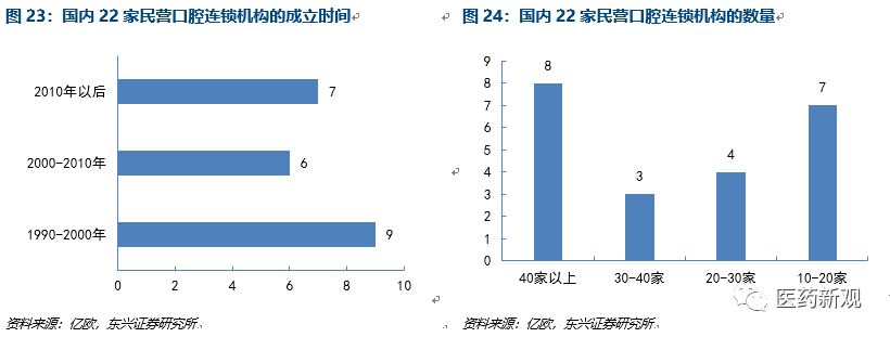 口腔機(jī)構(gòu)間的連鎖化發(fā)展逐漸呈現(xiàn)“馬太應(yīng)”。2010年以后,連鎖口腔機(jī)構(gòu)迎來新的增長期?;目谇粰C(jī)構(gòu)逐漸發(fā)掘中國市場,如美奧口腔、馬瀧齒科等,國內(nèi)外的口腔醫(yī)療機(jī)構(gòu)通過投資并購的多品牌連鎖模式實現(xiàn)連鎖化發(fā)展。其中有8家口腔機(jī)構(gòu)的連鎖數(shù)量達(dá)40家及以上,泰康拜博口腔連鎖數(shù)量約200余家,連鎖機(jī)構(gòu)的數(shù)量多;有7家口腔機(jī)構(gòu)的連鎖數(shù)量在10-20家,其中包括好牙醫(yī)口腔、可恩口腔、牙博士口腔等。另有,有3家連鎖數(shù)量在30-40家,有4家連鎖數(shù)量在20-30家。