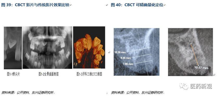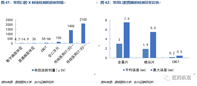 在口腔醫(yī)療領(lǐng)域技術(shù)優(yōu)勢,可替代傳統(tǒng)螺旋式 CT、全景機(jī)。CBCT的空間分辨率高,圖像拍攝誤差更低。臨床數(shù)據(jù)研究顯示,CBCT的診斷平均誤差僅為0.2mm,大誤差僅為0.5mm,相比全景片、根尖片檢測度更高。CBCT的放射劑量僅為55-66uSV,比較全景機(jī)放射劑量在150uSV,傳統(tǒng)CT的放射劑量在1400-2100uSV,使用更加可靠。