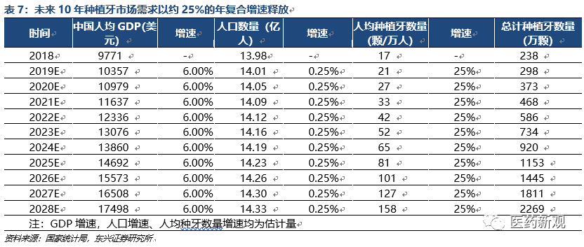 我們對未來植牙量的預(yù)測:未來10年年均復(fù)合增速為25%。我們假設(shè)到2019年-2028年十年間,潛在2155萬顆種植牙需求數(shù)量將逐漸釋放。預(yù)測數(shù)據(jù)如下: