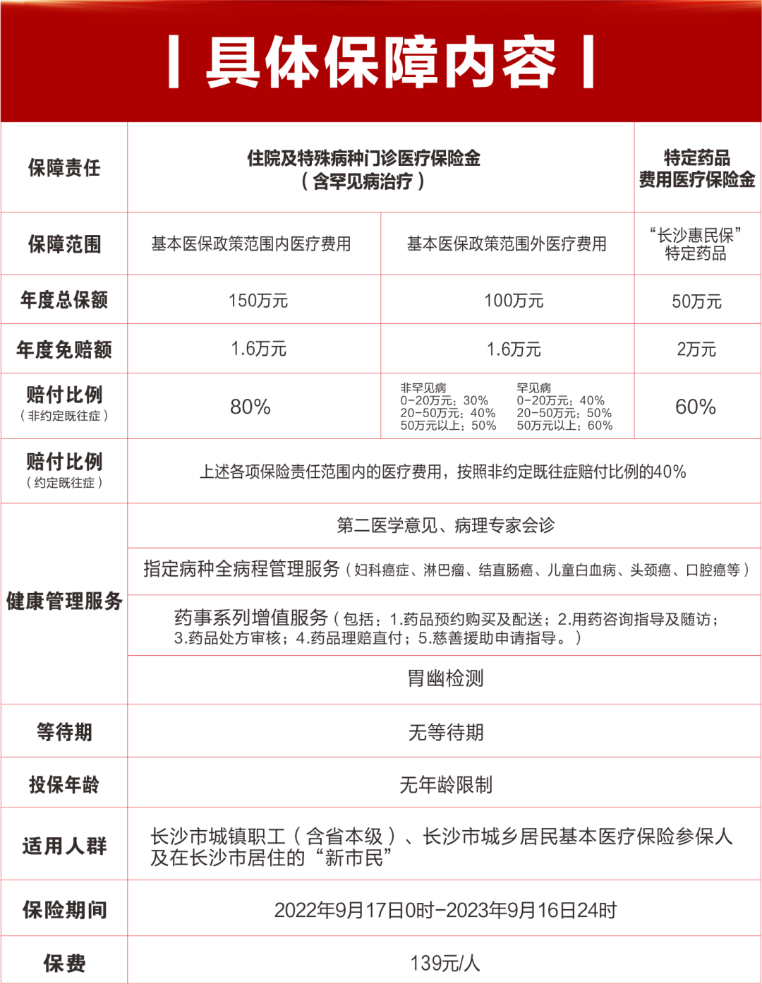2022年“長(zhǎng)沙惠民保”是在湖南省醫(yī)療保障局、長(zhǎng)沙市醫(yī)療保障局的共同指導(dǎo)下,為長(zhǎng)沙醫(yī)保參保人及長(zhǎng)沙“新市民”定制并優(yōu)化升級(jí)的一款普惠型補(bǔ)充醫(yī)療保險(xiǎn)。繼續(xù)堅(jiān)持低參保門檻、低保費(fèi)、緊密銜接醫(yī)保、重病高保障的基本定位。在過去一年經(jīng)驗(yàn)和總結(jié)的基礎(chǔ)上降低免賠額、擴(kuò)大參保人群、增加特藥種類等,將惠民特性進(jìn)行到底。