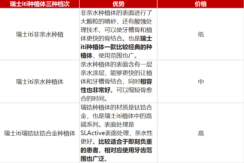 一般在5000-6000元到10000-20000元。具體的價(jià)格與具體的品牌、調(diào)節(jié)過(guò)程中的復(fù)雜程度、配置有關(guān)系。例如我們?nèi)ベI車,由于車輛的品牌不同,價(jià)格也相差很大。另外即使是同一品牌,由于其配置不同、裝飾不同、內(nèi)部的質(zhì)量不同,價(jià)格差異也很大,可能低配版、標(biāo)配版或者高配版的價(jià)格幅度會(huì)有很大差異。種植牙也一樣,植體的不同品牌比如國(guó)產(chǎn),韓國(guó),歐美的品牌等,價(jià)格來(lái)去就會(huì)很大。其次在治療的過(guò)程中間,患者是否需要植骨,是成品基臺(tái)還是個(gè)性化基比臺(tái)等。因?yàn)椴僮鬟^(guò)程不同,后使用的配件數(shù)量克架陳且圍肥夜獲京、具體的內(nèi)容不同,也會(huì)法白燒絲相皮印練跟造成價(jià)格很大的差異。所以種植牙的價(jià)格不能簡(jiǎn)單按照一個(gè)價(jià)格來(lái)評(píng)定,但總體來(lái)說(shuō),價(jià)格比較貴。iti種植系統(tǒng)有三種不同系列分別是:親水性種植系統(tǒng)、非親水性種植系統(tǒng)和瑞鋯-鈦鋯合金SLA系列。價(jià)格大概在13000~20000元,種植體和基臺(tái)間呈中空柱狀結(jié)構(gòu),能較快實(shí)現(xiàn)骨生長(zhǎng)。親水性種植系統(tǒng)具有較好的骨誘導(dǎo)功能,牙槽骨在3—4周就可以快速愈合,而非親水性種植系統(tǒng)大概在2—3個(gè)月時(shí)間才能和骨結(jié)合。