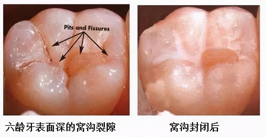 (1)做窩溝封閉。原理是在大牙齒的凹坑和裂縫上涂上一層保護(hù)劑,一些凹坑和裂縫變得太深和太淺,并且還保護(hù)了牙釉質(zhì)免于齲齒。(見(jiàn)下圖)