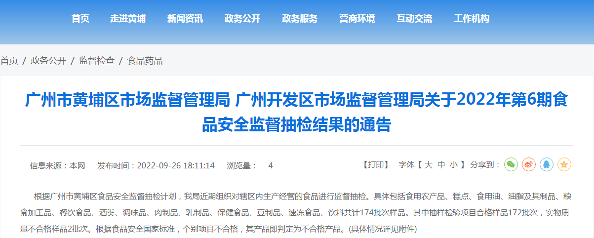 廣州市黃埔區(qū)市場監(jiān)督管理局 廣州開發(fā)區(qū)市場監(jiān)督管理局關(guān)于2022年第6期食品監(jiān)督抽檢結(jié)果的通告
