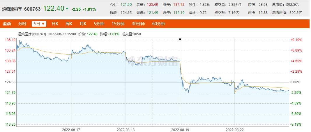 不過,早在醫(yī)保局正式發(fā)文以前,就有種植牙集采的相關(guān)消息傳出。8月15日,通策醫(yī)療盤中大跌逾9%,報(bào)收135.43元/股。此后,通策醫(yī)療股價(jià)一路下挫,截至8月22日收盤,通策醫(yī)療收跌1.81%,報(bào)122.4元/股,總市值392.5億元。