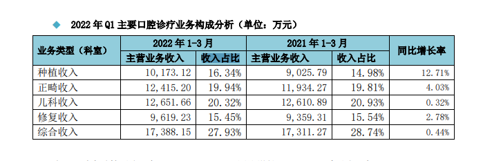 據(jù)通策醫(yī)療一季報(bào),其種植醫(yī)療服務(wù)收入1.02億元,同比增長12.71%,收入占比為16.34%,為主要口腔診療業(yè)務(wù)中增長快的項(xiàng)目。