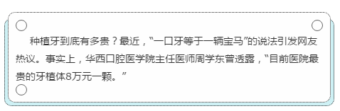 據(jù)知情人士透露,目前從正規(guī)渠道批準進來的種植體,各項成本不會低于3000元。如果從種牙開始到完成,一顆牙齒只收三四千元肯定有問題。這還可能是商家為低價吸引顧客把收費分解,在后期調(diào)節(jié)中再加收其他費用。