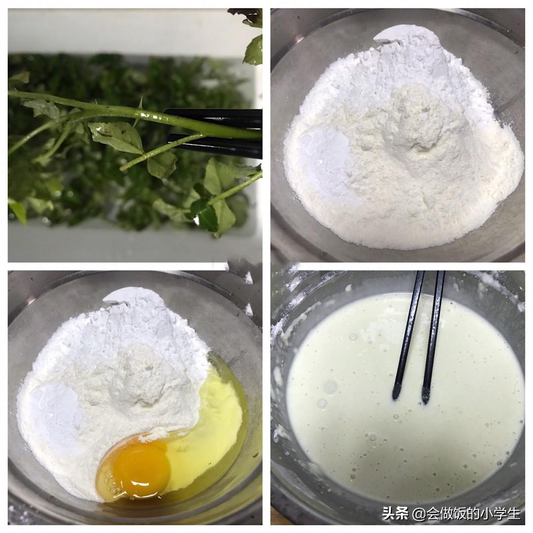 3??花椒芽裹滿面糊,再用手捏住一端,用筷子捋一下,去除多余面糊