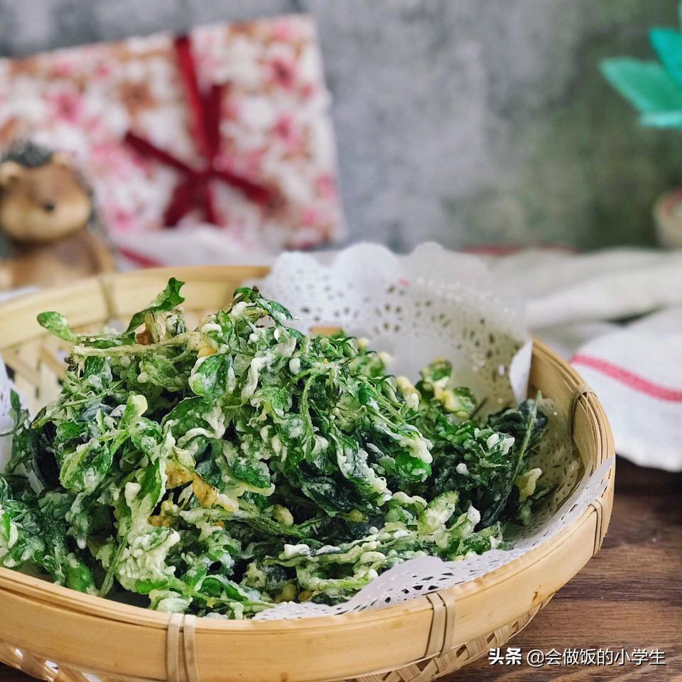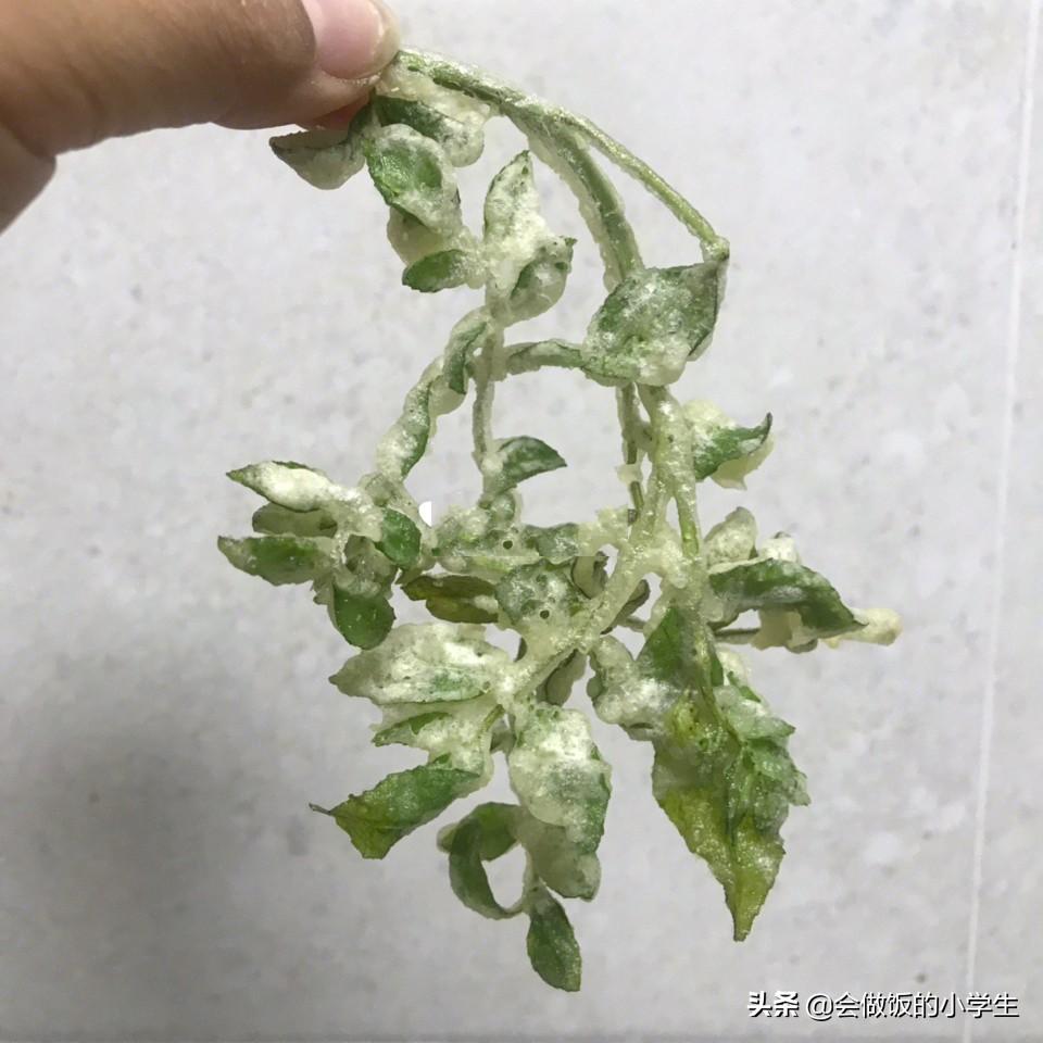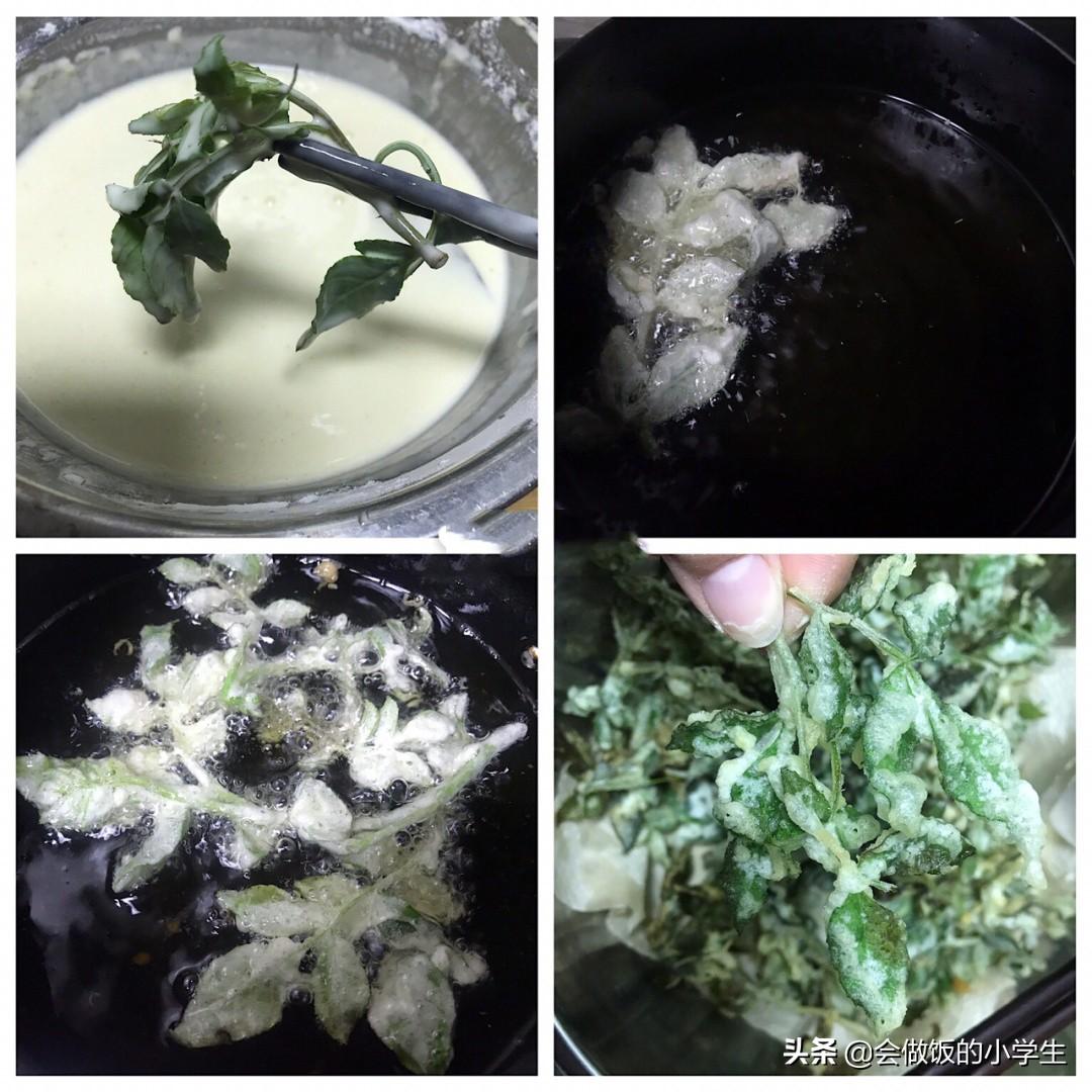 4??油溫?zé)?成熱的時候可以試一下油溫,一般油7、8成熱的時候,下入裹好面糊的花椒芽,花椒芽自動就攤開了
