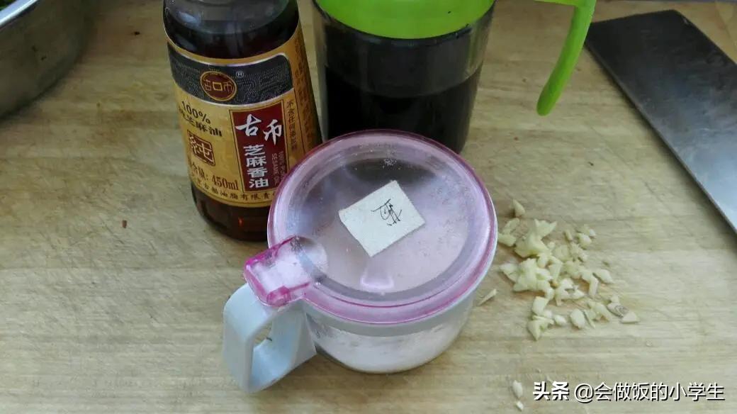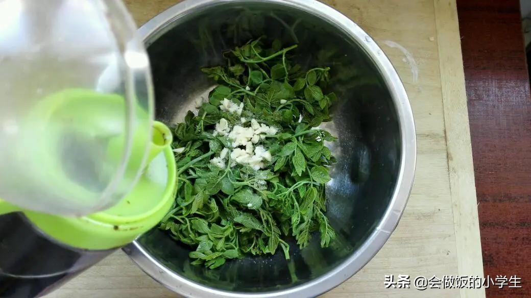 第四步:花椒芽、蒜末、鹽放入盆中,加入少許的醋再加入幾滴香油攪拌均勻