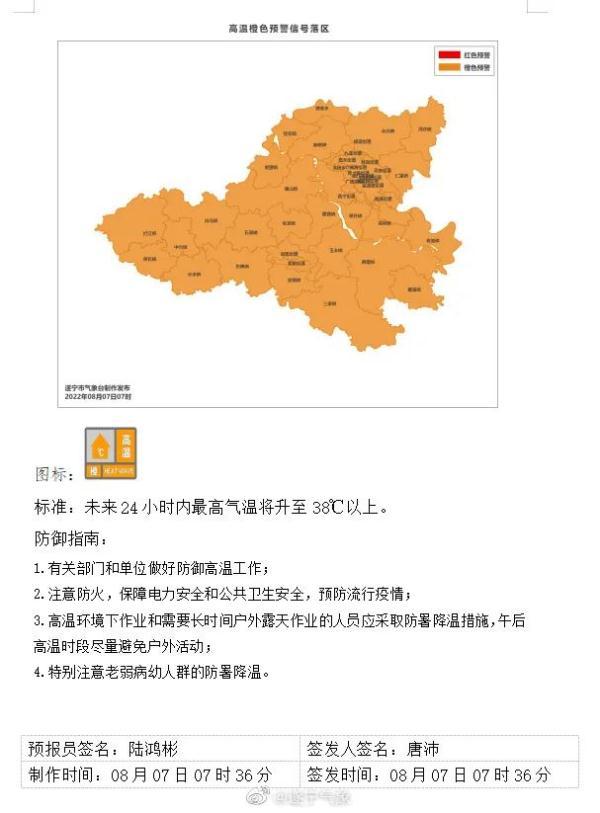 遂寧市氣象臺(tái)2022年08月07日07時(shí)36分發(fā)布高溫橙色預(yù)警信號(hào):預(yù)計(jì)今天午后,楊渡街道、慈音街道、靈泉街道、富源路街道、南強(qiáng)街道、九蓮街道、廣德街道、鳳凰街道、柔剛街道、保升鎮(zhèn)、老池鎮(zhèn)、桂花鎮(zhèn)、新橋鎮(zhèn)、河沙鎮(zhèn)、復(fù)橋鎮(zhèn)、仁里鎮(zhèn)、龍鳳鎮(zhèn)、常理鎮(zhèn)、聚賢鎮(zhèn)、磨溪鎮(zhèn)、西眉鎮(zhèn)、玉豐鎮(zhèn)、三家鎮(zhèn)、保石鎮(zhèn)、攔江鎮(zhèn)、石洞鎮(zhèn)、分水鎮(zhèn)、東禪鎮(zhèn)、會(huì)龍鎮(zhèn)、橫山鎮(zhèn)、中興鎮(zhèn)、白馬鎮(zhèn)、安居鎮(zhèn)、北固鎮(zhèn)、唐家鄉(xiāng)等鄉(xiāng)鎮(zhèn)(街道)高氣溫將升至38℃以上,局地可達(dá)40℃以上。
