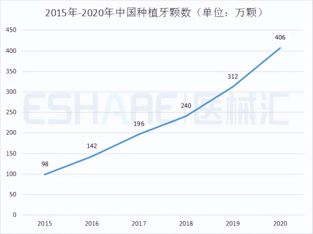據(jù)《2020年中國(guó)口腔醫(yī)療行業(yè)報(bào)告》數(shù)據(jù)顯示,2020年我國(guó)種植牙數(shù)量約為406萬(wàn)顆,目前我國(guó)種植牙市場(chǎng)規(guī)模已近1600億元,是增長(zhǎng)快的種植牙市場(chǎng)之一。