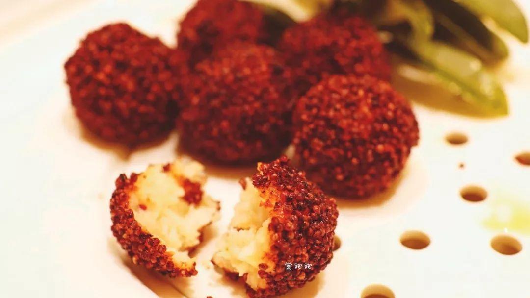 楊梅藜麥河蝦球:取材長江蝦。剝殼取肉斬成茸,加馬蹄丁、調(diào)味料,攪拌均勻,裹上藜麥炸制成熟,形似楊梅,鮮香脆甜。喜歡吃蝦的我,對這道菜偏愛有佳。