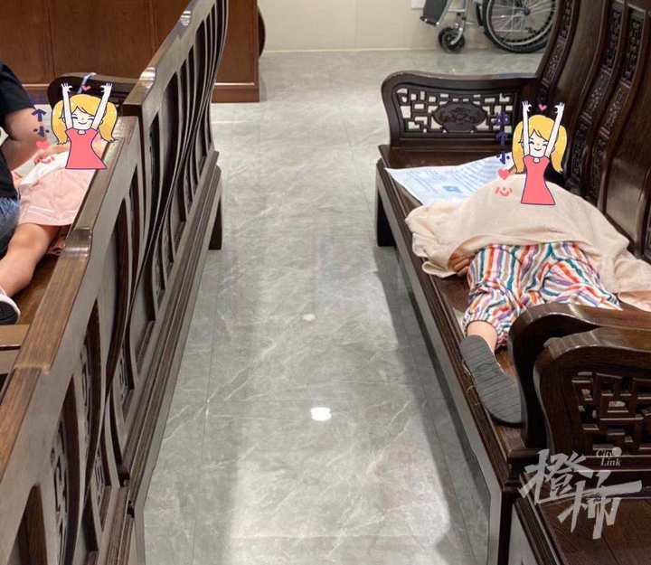 22點44分,在門口候診區(qū)睡著的兩個小女孩