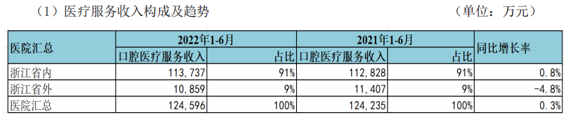 在公司營(yíng)收構(gòu)成中,醫(yī)療服務(wù)收入仍是主力。報(bào)告期內(nèi),醫(yī)療服務(wù)收入達(dá)12.46億元,占總營(yíng)收的94.52%。其中,浙江省內(nèi)收入達(dá)11.37億元,占口腔醫(yī)療服務(wù)收入的91%,與上年同期相比增長(zhǎng)0.8%;浙江省外收入1.09億元,占口腔醫(yī)療服務(wù)收入的9%,與上年同期相比減少4.8%。