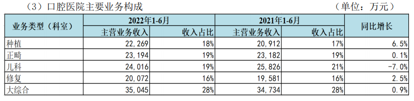 在口腔醫(yī)院主要業(yè)務(wù)構(gòu)成中,大綜合業(yè)務(wù)收入占比高,為28%,同比增長(zhǎng)0.9%;修復(fù)業(yè)務(wù)占比低,為16%,同比增長(zhǎng)2.5%。此外種植業(yè)務(wù)占比18%,同比增長(zhǎng)6.5%;正畸業(yè)務(wù)和兒科業(yè)務(wù)占比均為19%,分別同比增長(zhǎng)0.1%、同比下降7%。