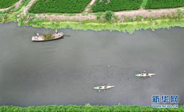 8月8日,皮劃艇行進在張浦鎮(zhèn)尚明甸村的河道中(無人機照片)。 近年來,江蘇省昆山市張浦鎮(zhèn)推進以生態(tài)農(nóng)業(yè)、綠色農(nóng)業(yè)、旅游農(nóng)業(yè)為核心的鄉(xiāng)村建設(shè),經(jīng)濟持續(xù)高發(fā)展,2019年農(nóng)民人均純收入達46695元,農(nóng)村面貌日益改良。 新華社記者楊磊攝