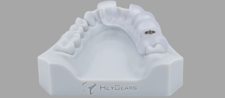 黑格科技通過3D打印技術(shù)制作的種植導板,透明部分可與患者牙齒嚴絲合縫,醫(yī)生通過預留的金屬孔洞鉆孔即可