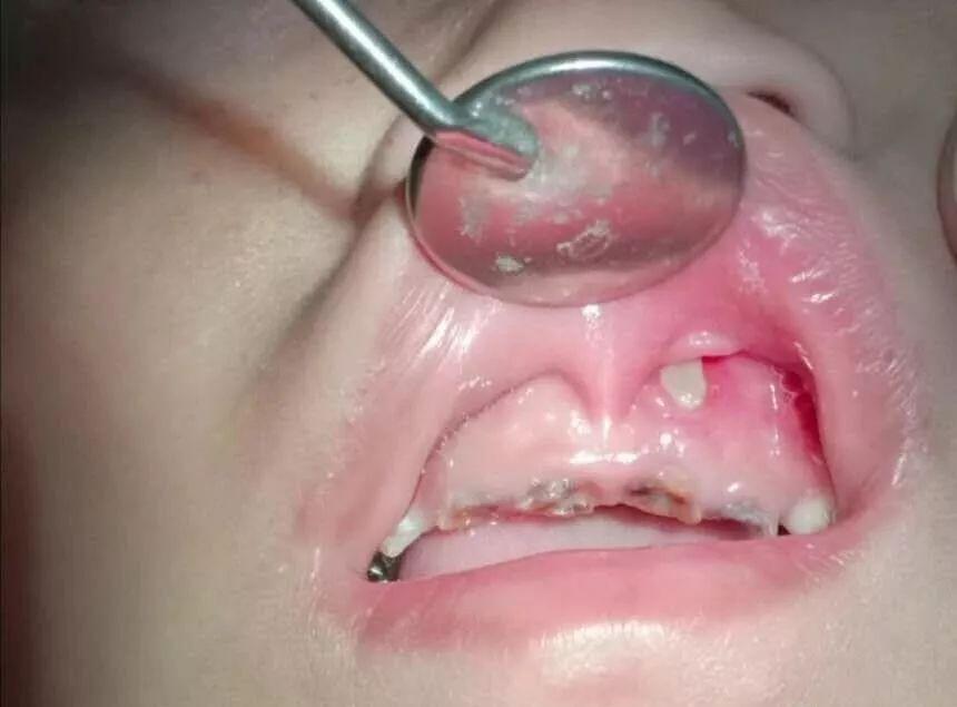 而且有這樣的一種現(xiàn)實,哪怕全口牙齲壞也鮮有家長為此主動去看牙醫(yī),更多的是當孩子出現(xiàn)了劇烈牙痛或者牙齦上長出了令家長們驚恐的如圖示腫物(恐癌心理)才被迫就診,這是一種中國式特色——反正乳牙都是要換掉的,單純齲齒治不治無所謂。