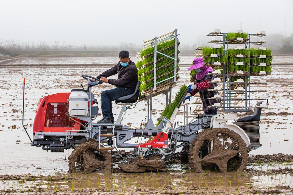 △2022年3月,浙江省溫嶺市一家庭農(nóng)場,農(nóng)民駕駛缽苗擺栽機進行作業(yè)。
