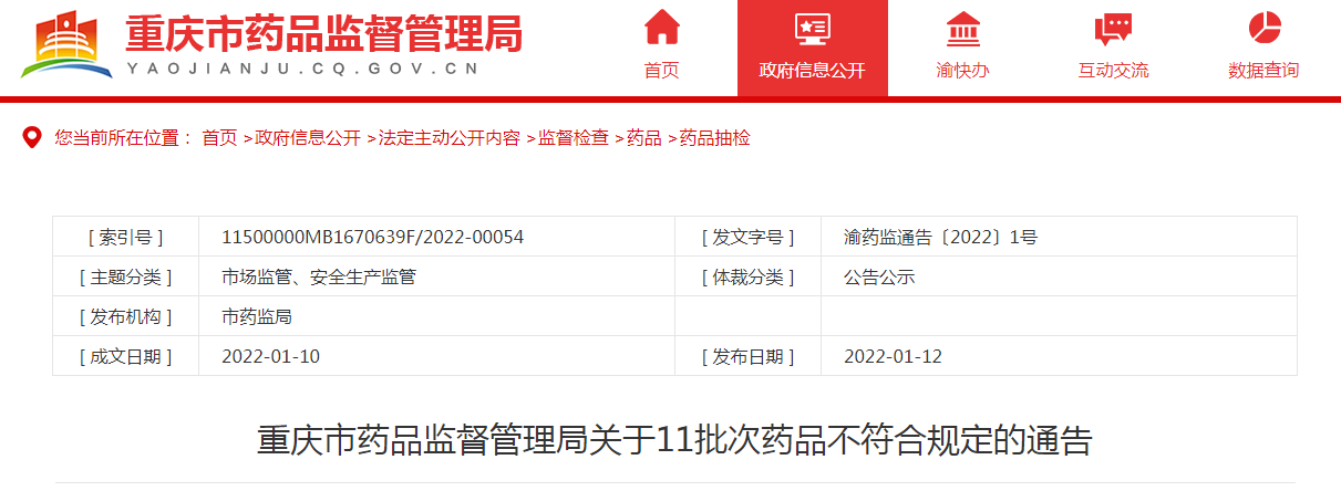 中國(guó)質(zhì)量新聞網(wǎng)訊 2022年1月12日,重慶市藥品監(jiān)督管理局網(wǎng)站發(fā)布關(guān)于11批次藥品不符合規(guī)定的通告。通告稱,為了加強(qiáng)藥品質(zhì)量監(jiān)督管理,規(guī)范市場(chǎng)秩序,保障公眾用藥,該局組織局屬檢查局、各區(qū)縣藥品監(jiān)管部門(mén)和檢驗(yàn)機(jī)構(gòu)開(kāi)展藥品抽檢。經(jīng)重慶市食品藥品檢驗(yàn)檢測(cè)研究院等檢驗(yàn)機(jī)構(gòu)檢驗(yàn),標(biāo)示為廣西慧寶源醫(yī)藥科技有限公司等9家企業(yè)(醫(yī)院)生產(chǎn)(配制)的11批次藥品不符合規(guī)定。