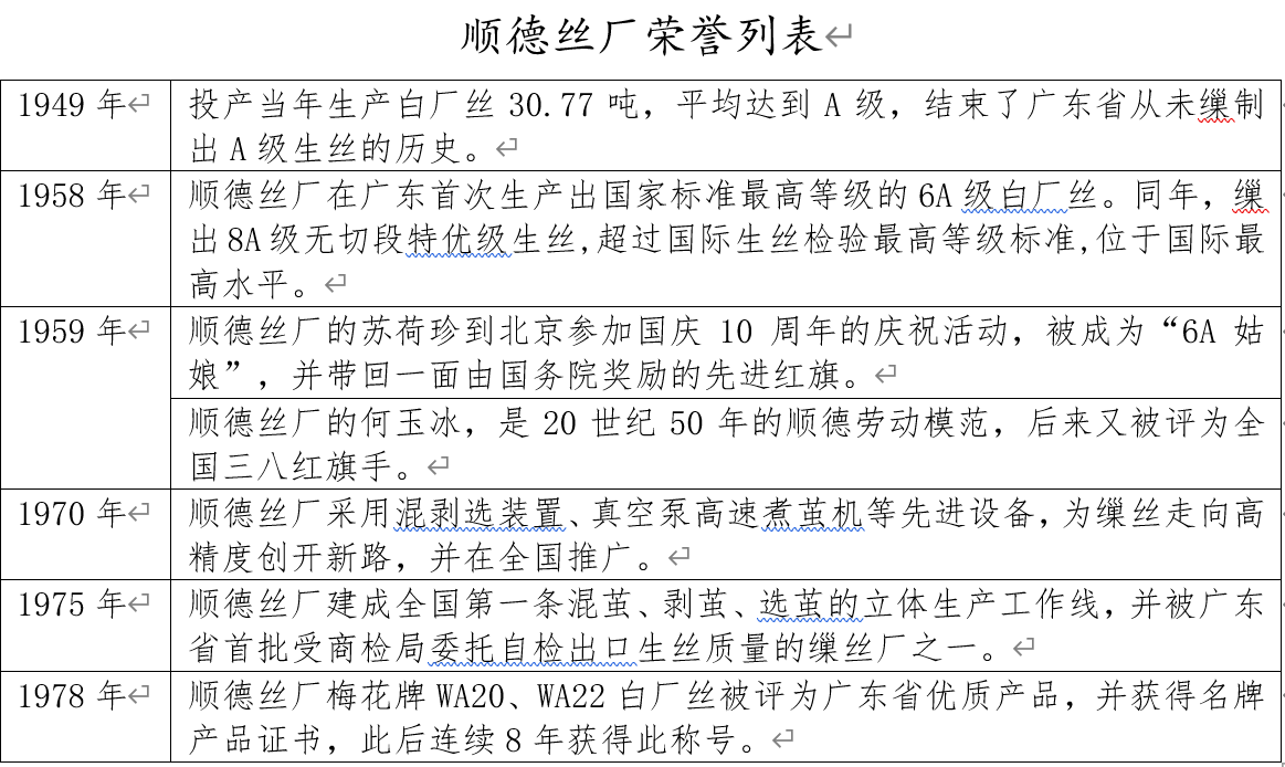 無怪乎吳曼芙這么自豪。作為廣東省大型現(xiàn)代化高級(jí)生絲示范廠,順德絲廠曾在全省、全國獲獎(jiǎng),以順德絲廠為龍頭的絲織業(yè)更是新中國成立后順德的支柱產(chǎn)業(yè)之一,為順德工業(yè)化先聲奪人立下汗馬功勞。