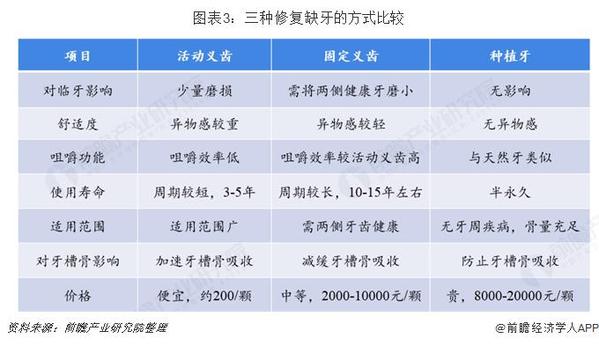 目前常用的缺牙修復方式主要有3種,分別是活動義齒、固定義齒和種植牙?;顒恿x齒即通常所說的假牙,這種方式價格便宜、制作簡單、磨除牙體組織少,但是異物感強、穩(wěn)定性較差、咀嚼功能受限、存在口腔衛(wèi)生問題等;固定義齒,即烤瓷牙,則是通過把缺失牙兩邊的健康牙磨小,變成“橋墩”,來架住缺失的牙齒。這種方式不需要頻繁摘下清洗,咀嚼功能較強,無異物感。缺點是需要磨損天然牙齒,對剩余鄰牙要求高;種植牙與前兩種方式相比,不損傷正常牙齒,咀嚼功能類似天然牙,舒適美觀,使用周期長,是目前果好的缺牙修復方式。但種植手術(shù)相對復雜,種植牙費用高。