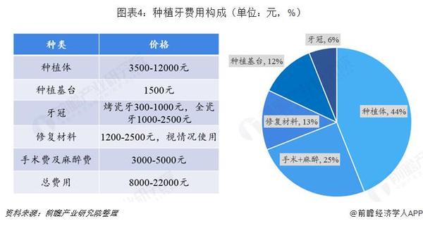 目前國內(nèi)市場上種植牙手術(shù)的費用大概在8000-22000元,其中種植體作為核心材料,費用高,一般達到3500-12000元,占整個手術(shù)費用的44%。其次為手術(shù)費+麻醉費3000-5000元(25%),修復材料1200-2500元(13%),種植基臺1500元(12%),牙冠分烤瓷牙300-1000元,或全瓷牙1000-2500元(6%)。