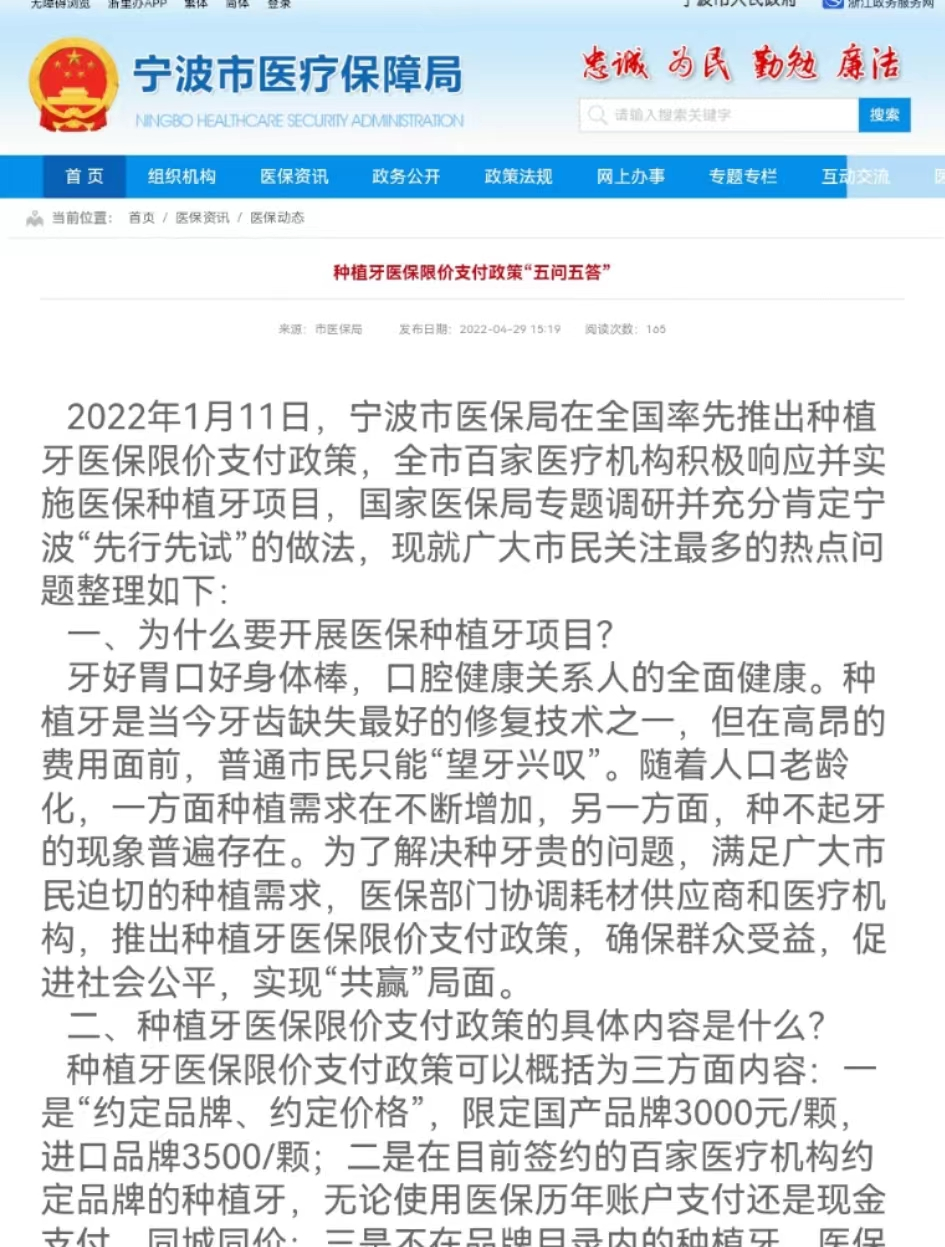 4月29日,寧波市醫(yī)療保障局發(fā)布消息稱,全國率先推出種植牙醫(yī)保限價支付政策,并組織百家醫(yī)療機構(gòu)開展集體簽約。