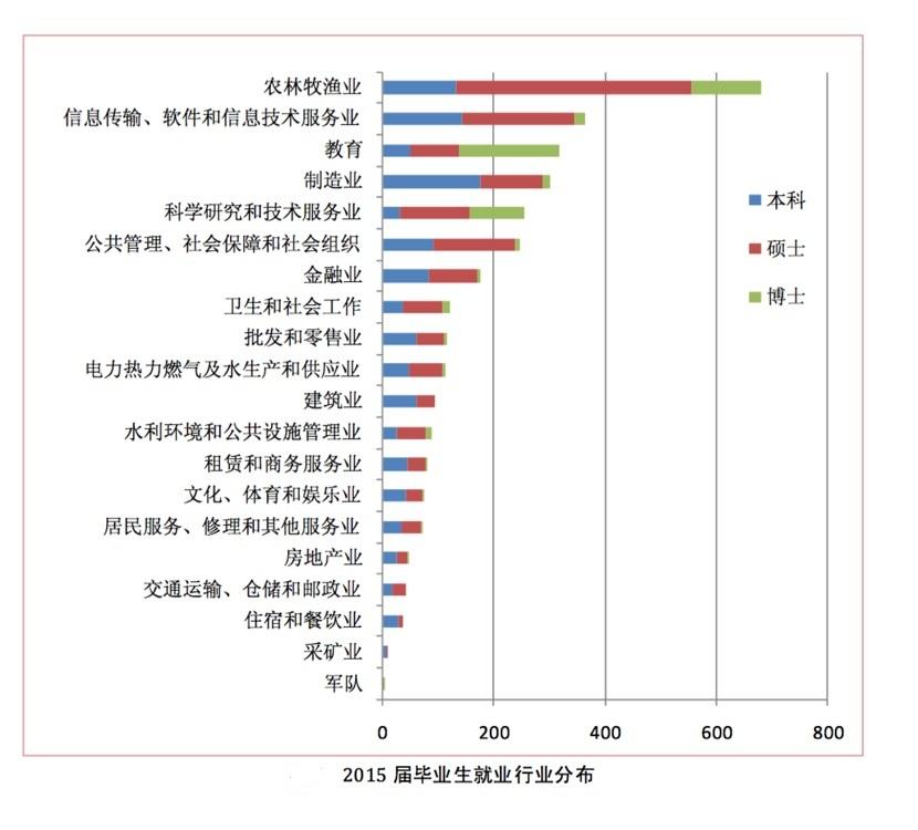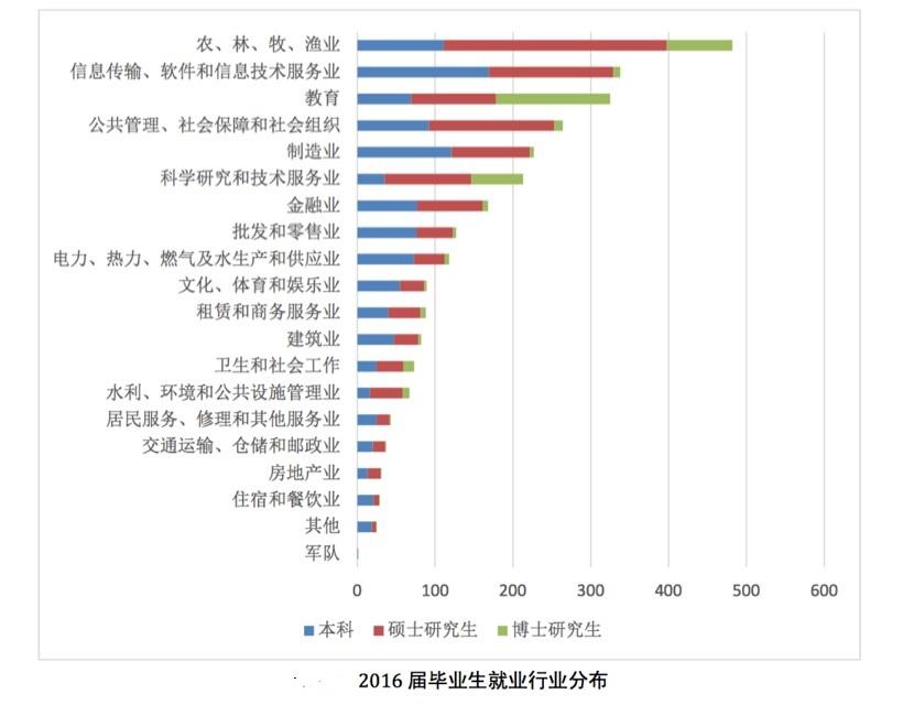 與此同時(shí),記者在中國農(nóng)業(yè)大學(xué)的官網(wǎng)上找到一份《中國農(nóng)業(yè)大學(xué)2018年畢業(yè)生就業(yè)質(zhì)量報(bào)告》,依照統(tǒng)計(jì)局行業(yè)分類標(biāo)準(zhǔn),中國農(nóng)業(yè)大學(xué) 2018 屆畢業(yè)生就業(yè)行業(yè)前三位分別為農(nóng)林牧漁業(yè),教育,公共管理、社會(huì)保障和社會(huì)組織。農(nóng)林牧漁業(yè)作為中農(nóng)大的傳統(tǒng)就業(yè)方向,2018屆5144位畢業(yè)生里有超過400位投入其中進(jìn)行擇業(yè)。而2017年,具體數(shù)據(jù)沒有標(biāo)注。而同一網(wǎng)站上,2016年的數(shù)據(jù)報(bào)告則表明,當(dāng)屆有近500位畢業(yè)生選擇農(nóng)林牧漁業(yè)進(jìn)行就業(yè)。再把目光跳回2015年時(shí),當(dāng)屆選擇同一領(lǐng)域的畢業(yè)生則逼近700人。