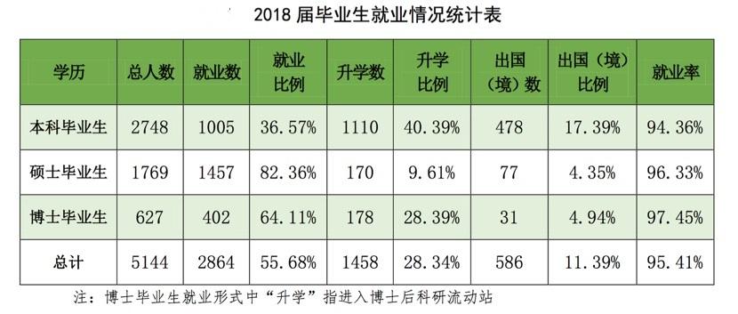 《中國農(nóng)業(yè)大學(xué)2018年畢業(yè)生就業(yè)質(zhì)量報(bào)告》顯示,中國農(nóng)業(yè)大學(xué)2018屆畢業(yè)生共5144人,其中本科畢業(yè)生2748人,1005人畢業(yè)后參加工作,就業(yè)比例達(dá)到36.57%。而當(dāng)屆畢業(yè)生升學(xué)數(shù)則為1110人(升學(xué)比例40.39%),以微弱優(yōu)勢高于就業(yè)人數(shù)。此外,另有478位畢業(yè)生選擇畢業(yè)后出國。