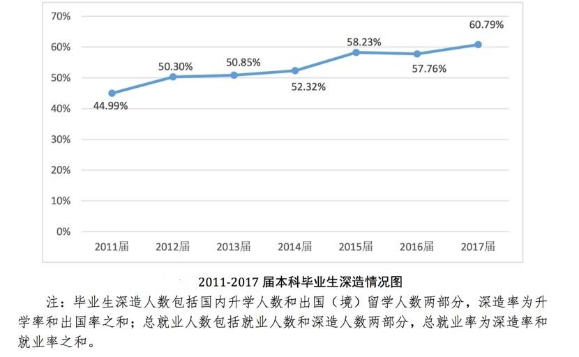 對(duì)此,記者在2017年的就業(yè)質(zhì)量報(bào)告中,找到了中國農(nóng)業(yè)大學(xué)官方披露的2011-2017屆本科畢業(yè)生深造情況圖表,在這份統(tǒng)計(jì)里,學(xué)校把國內(nèi)外升學(xué)人數(shù)做了統(tǒng)一計(jì)算、對(duì)比。從圖中觀察,2011屆本科畢業(yè)生升學(xué)率為44.99%,而到了2017屆時(shí),本科畢業(yè)生的升學(xué)率迅速竄升至60.79%,并存在逐年上升趨勢。