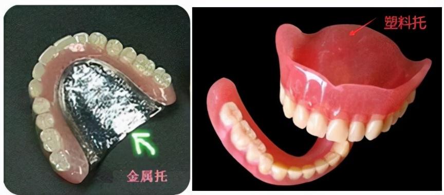 因制作材料有所不同,全口活動義齒(假牙)材料分為樹脂塑料膠托和金屬托。