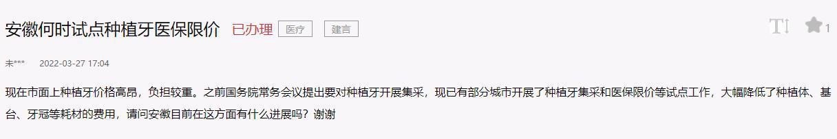 近日,在人民網(wǎng)“領(lǐng)導(dǎo)留言板”上,有網(wǎng)友給安徽省委書記留言,建議通過試點(diǎn)種植牙醫(yī)保限價(jià),推動(dòng)種植牙價(jià)格下調(diào)。該網(wǎng)友表示,現(xiàn)在市面上種植牙價(jià)格高昂,市民進(jìn)行口腔醫(yī)療負(fù)擔(dān)較重,建議安徽可以借鑒其他省市經(jīng)驗(yàn),“現(xiàn)已有部分城市開展了種植牙集采和醫(yī)保限價(jià)等試點(diǎn)工作,大幅降低了種植體、基臺(tái)、牙冠等耗材的費(fèi)用。”