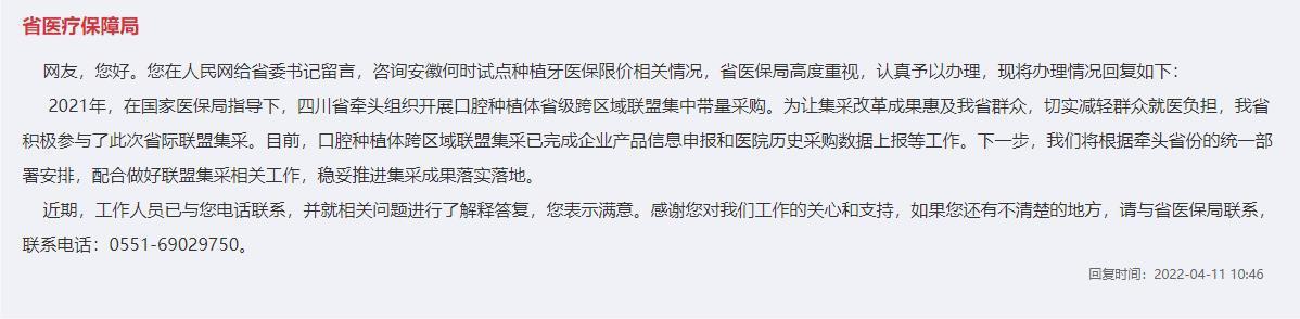 安徽在此方面進(jìn)展如何?收到留言后,安徽省醫(yī)保局給網(wǎng)友帶來了好消息:目前安徽省已積極參與到口腔種植體省級(jí)跨區(qū)域聯(lián)盟集中帶量采購中,未來有望切實(shí)減輕群眾就醫(yī)負(fù)擔(dān)。
