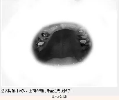 2015年9月,浙江寧波一19歲高中生因牙病就醫(yī)發(fā)現(xiàn),28顆牙全部爛光!拔掉8顆、折斷10顆,其余也沒一顆完整。該男孩從12歲開始把飲料當(dāng)水喝,嚼口香糖代替刷牙。醫(yī)生表示,從業(yè)二三十年,從來沒見過一個(gè)高中生的牙齒會爛成這樣。