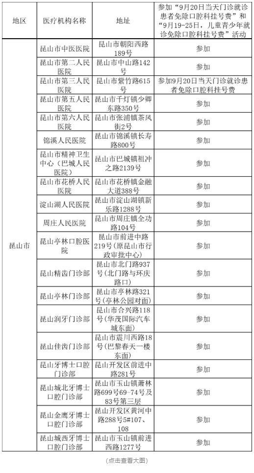 昆山19家醫(yī)院和口腔門(mén)診參加“9月20日當(dāng)天門(mén)診就診患者免除口腔科掛號(hào)費(fèi)”活動(dòng),18家參加“9月19-25日,兒童青少年就診免除口腔科掛號(hào)費(fèi)”活動(dòng)。