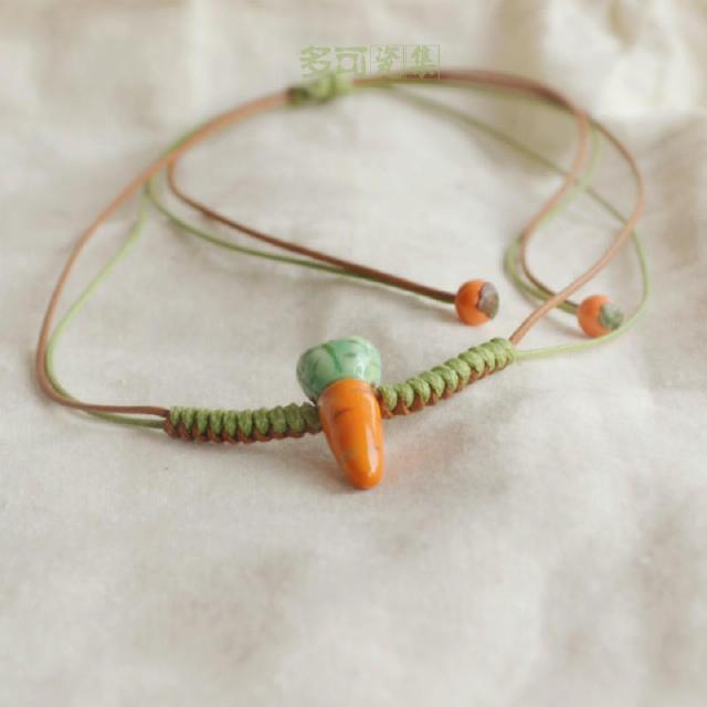 這款項(xiàng)鏈,適合喜歡簡(jiǎn)單大方清爽的女孩子,可愛的胡蘿卜造型,圓頭的綠色葉子,加上橘色的小蘿卜,很是簡(jiǎn)單耐看,讓人有忍不住想咬一口的沖動(dòng),胖胖的蘿卜頭,圓潤(rùn)又光滑,陶瓷來(lái)制作再好不過(guò)了,精巧的抽繩,吊墜的兩邊編織出了好看的形狀,既美觀又防止蘿卜亂動(dòng),細(xì)節(jié)部分也很贊哦。